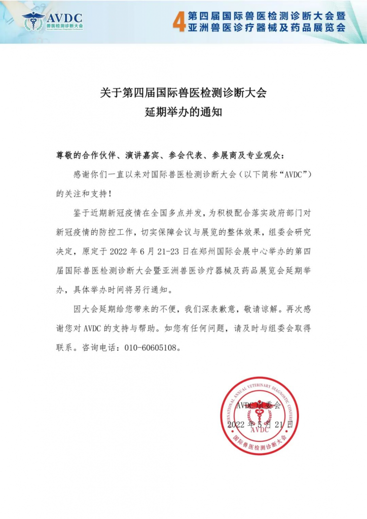 鉴于近期新冠疫情在全国多点并发,为积极配合落实政府部门对新冠疫情的防控工作,切实保障会议与展览的整体效果,组委会研究决定,原定于2022年6月21-23日在郑州国际会展中心举办的第四届国际兽医检测诊断大会暨亚洲兽医诊疗器械及药品展览会延期举办,具体举办时间将另行通知。